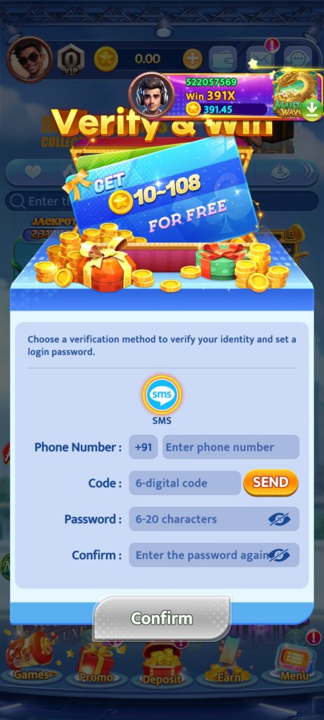 As soon as you allow the permission, you’ll see the option to register your account. Now enter your 10-digit mobile number, password, and click the confirm button. Your account will be registered in the Good Slots application.